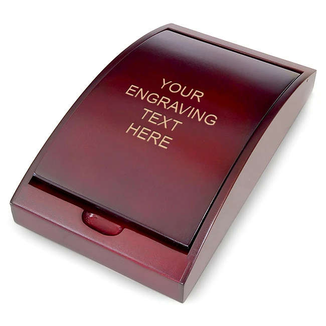 - The box can be laser engraved with up to three lines of text. The laser engraving removed the top layer of black finish to expose the light tan wood underneath