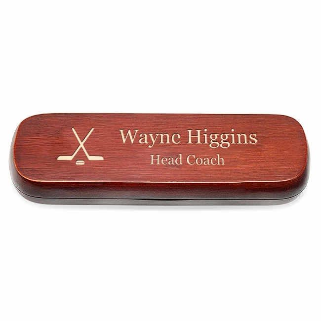 You’re sure to score the winning goal when you present the coach, MVP, or hockey enthusiast with this set! Two ballpoint pens with cherry wood barrels and gold accents are nestled in grooves inside a matching cherry wood box. The cover of the box is laser-engraved with crossed hockey sticks and a puck emblem. Personalization of the box next to the emblem, the pens, or both, is free with your purchase. This elegant set comes packaged in a gift box.